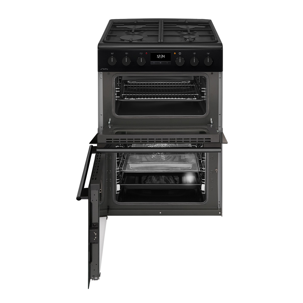 A/A Rated, Double cavity electric ovens, 4 zone gas hob, White LED Display, Matte Black, Rotary control with push button timer, Double glazed, Airfry tray, Telescopic shelf, 43/67L Capacity, Catalytic cleaning.