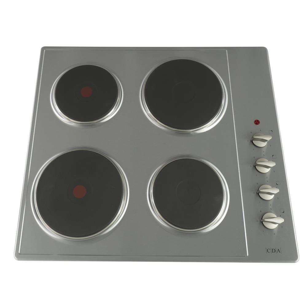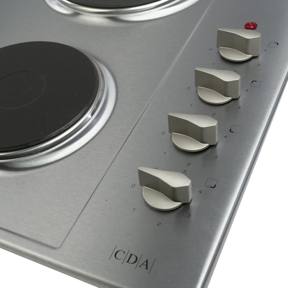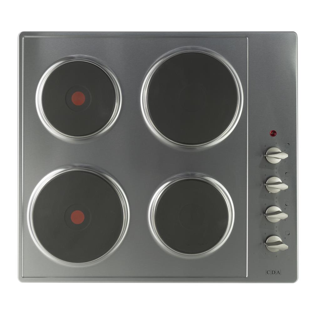 The HE6052SS is a practical four plate electric hob in a contemporary stainless steel. The hob has 6 power levels, in a range of plate sizes for different pans with two rapid plates and side control.