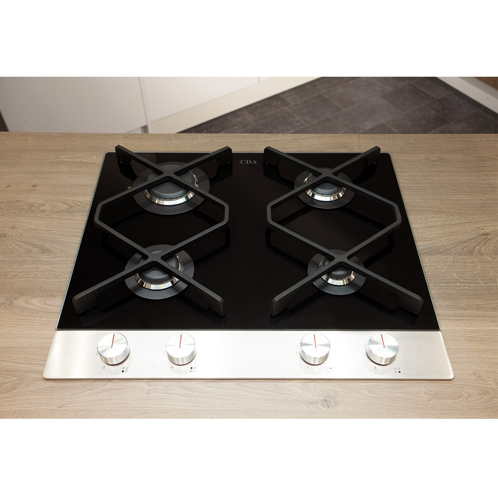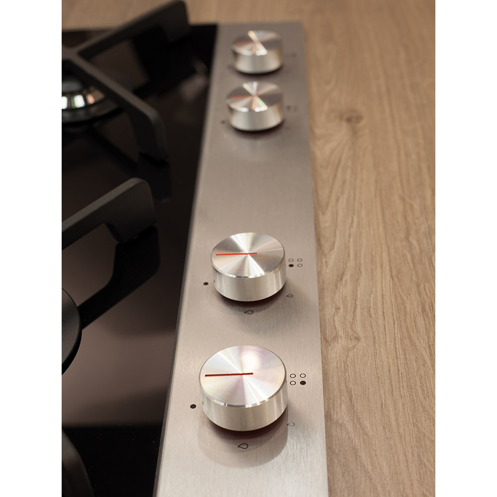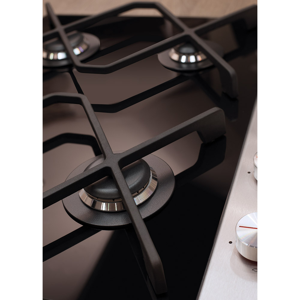 The designer HVG680BL is a 60cm four burner gas hob on a stylish black ceramic glass base with cast iron pan supports. The hob has 1 ultra rapid burner with a 4kW rating giving more power than a wok burner, along with 2 semi-rapid burners and a auxiliary burner to cater for all cooking styles. The HVG680BL also has a flame failure safety device for peace of mind.