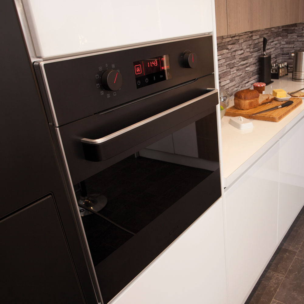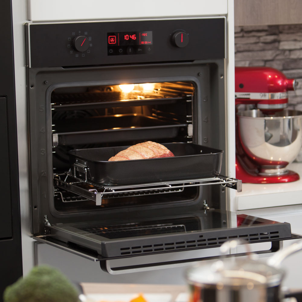 The SK700BL is a single oven with 11 functions to provide complete dexterity for your cooking ambitions, as well as including an Eco-clean function to cut down on cleaning time in your kitchen. The SK700BL is finished in our Designer Kitchen Range style with rotary LumiLight control knobs and a touch control display panel. There are also telescopic shelf runners, catalytic liners and a honeycombed deep roasting pan within the oven adding extra practical features.