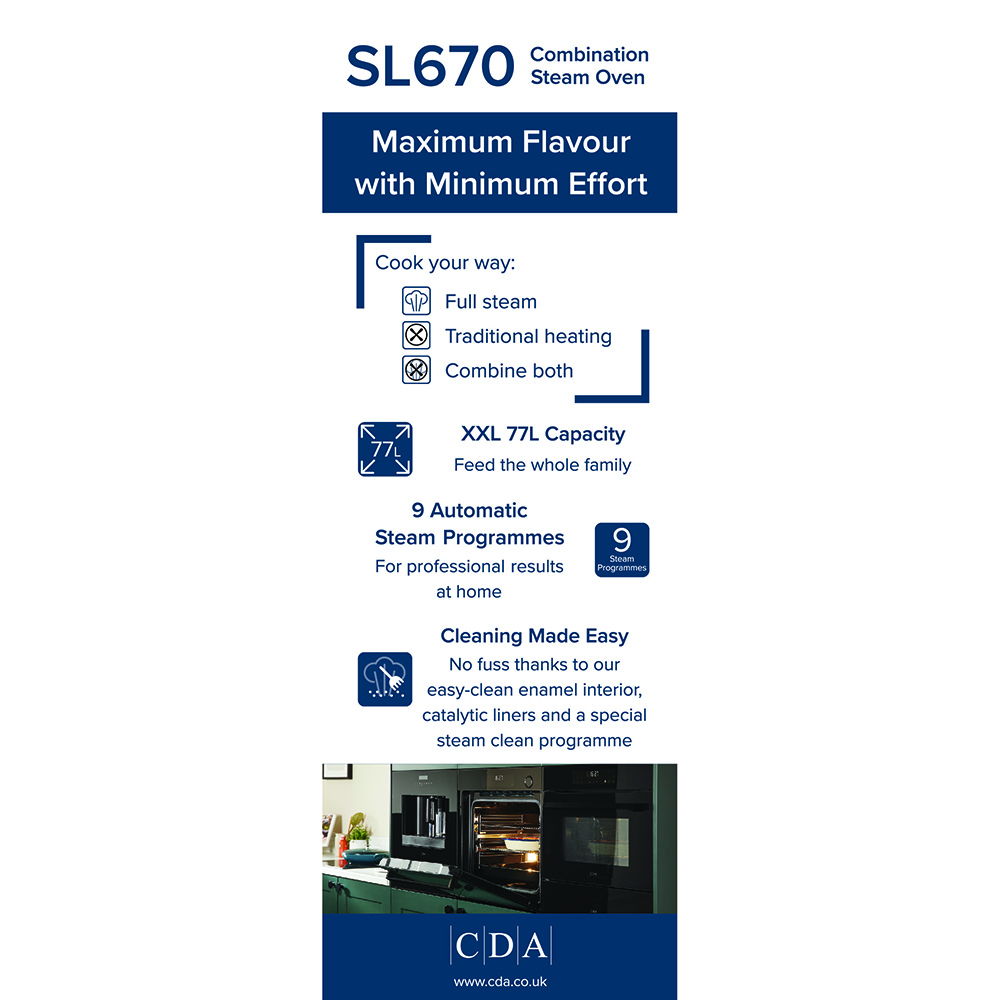 The SL670 is our top of the range complete cooking and self-cleaning oven model with 13 functions to choose from, including a rapid preheat mode, an extra-large 77L capacity and an intuitive 3-step quick touch control panel to select programme settings almost instantly. Choose from cooking with full steam, a combination of steam and traditional heat or simply use the familiar conventional and fan elements to produce perfect results every time. There is a steam cleaning function that will hygienically clean dirt and grease, eliminating harsh chemicals and elbow-grease from your routine. Enjoy the time-saving features and explore user-friendly details on this model, like telescopic slide-out shelving, a temperature probe to help achieve perfect roasts, automatic cooking programmes and a satisfying soft-close door action.
