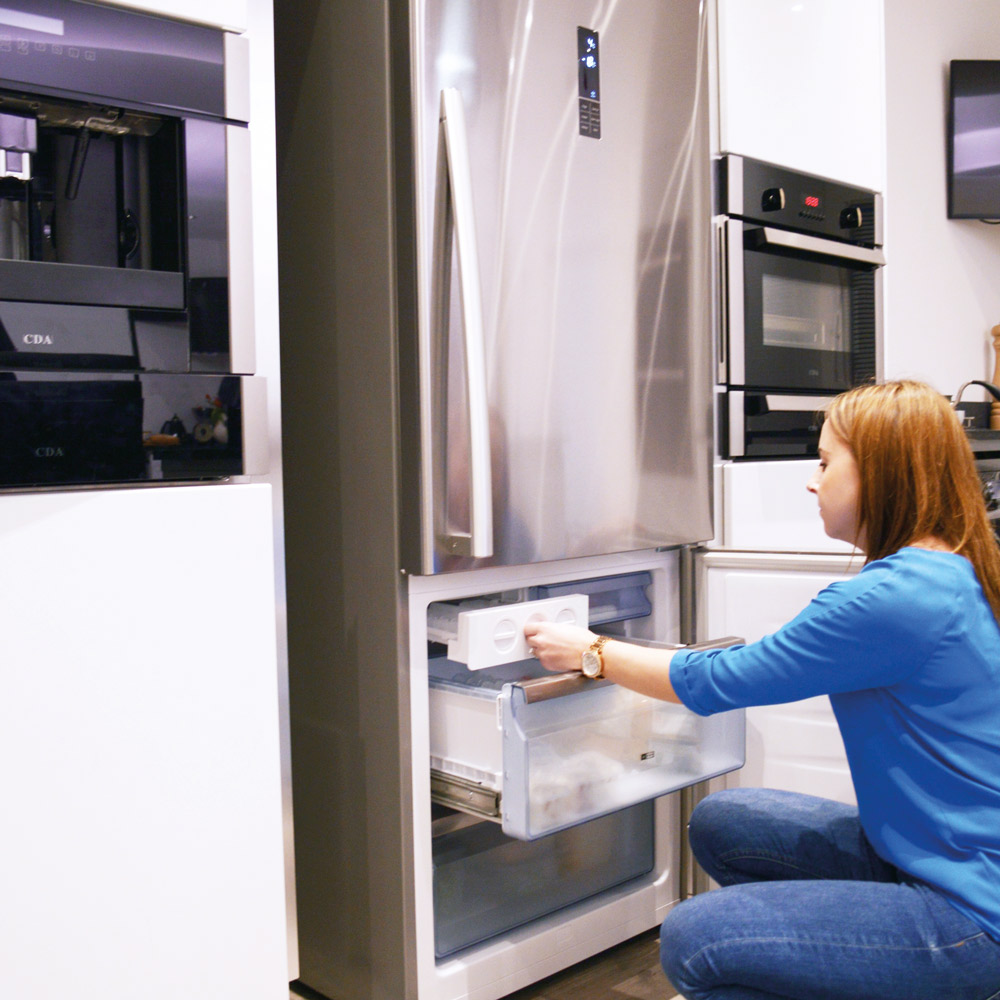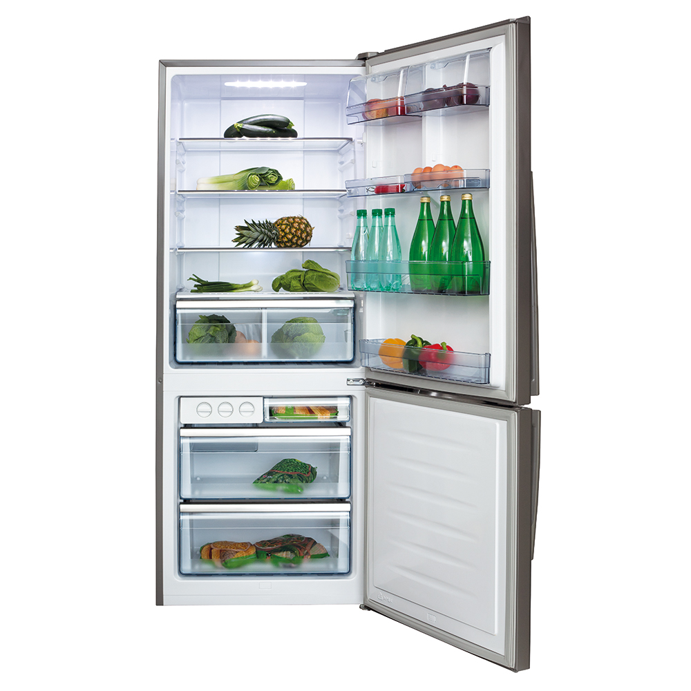 The new stainless steel premium combi offers an impressive 431L gross capacity along with an ice cube compartment with twist ice cube maker. It has total no frost technology ensuring fresher food, no build-up of frost and a more hygienic refrigerator.