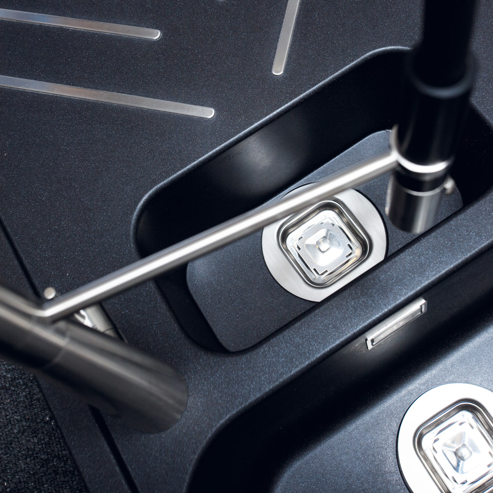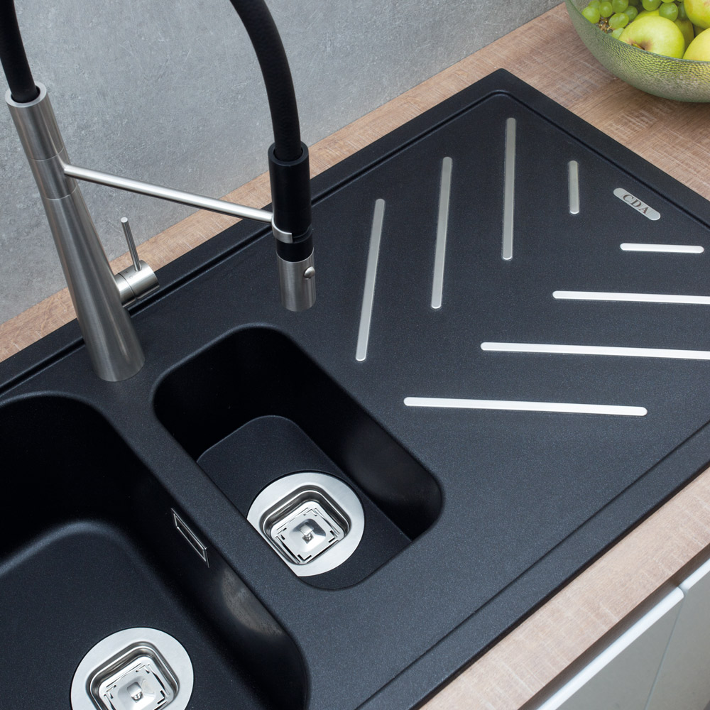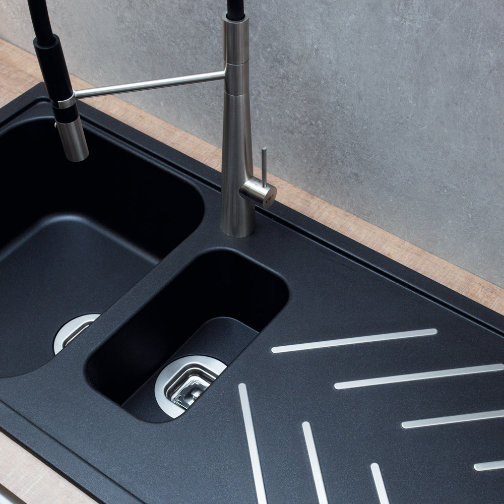 The KG82BL is a one and a half bowl composite sink in anthracite. It features integrated stainless steel drainer strips that act like a built-in trivet, providing a practical heat resistant surface for hot pans as well as an additional aesthetic detail to match black and stainless steel appliances.