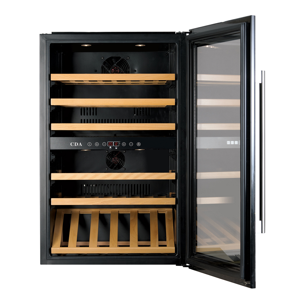 The FWV901SS is an integrated, dual zone wine cooler. Capable of holding up to 55 bottles, with LED lighting and triple UV protected smoked glass door, it will ensure your wine is kept in optimal conditions. It comes complete with 5 wooden slide out shelves, an electronic temperature control with a memory function and alarm and a display shelf to showcase your favourite wines.